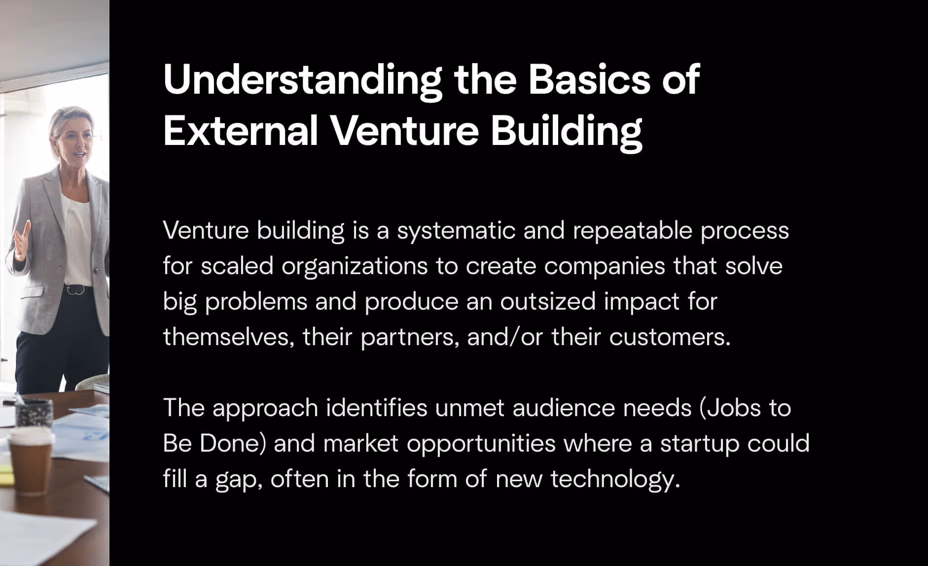 The approach, often executed with an outside venture builder, aims to identify unmet audience needs (i.e., Jobs to Be Done) and market opportunities where a startup could fill a gap, often in the form of a new technology.